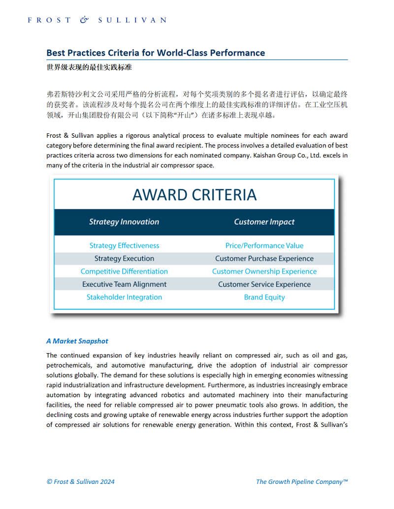Frost & Sullivan對開山獲得“全球工業壓縮機競爭戰略領導獎”的頒獎詞